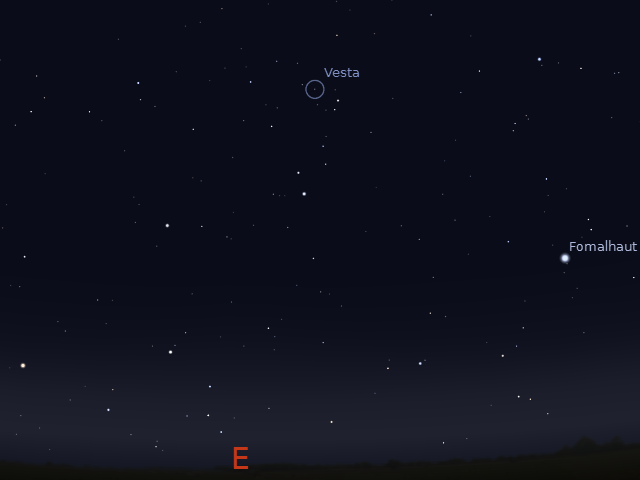 The location of Vesta as seen at 9:00 pm on July 23rd looking east from Adelaide, similar views will be seen at equivalent local times elsewhere. Click to embiggen,The asteroid Vesta is becoming brighter and is now readily visible in binoculars and is just over the threshold of unaided eye visibility (magnitude 5.9). To see it with the unaided eye you will need to be in a dark sky location though.
