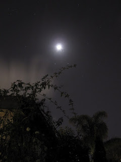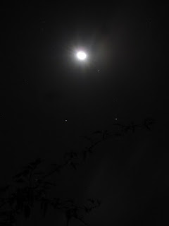 The cloud which had socked us in all day cleared up enough for me to take these images. I tried various exposure times, trying to balance overexposing the waxing but still crescent Moon with underexposing the stars.
