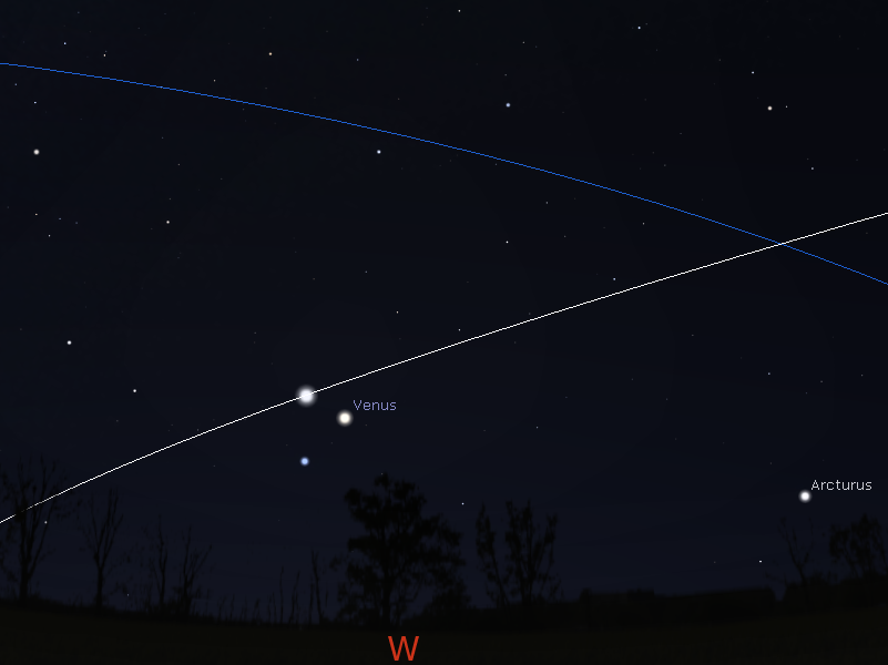 At the start of the week Venus is just below to the bright star Spica, the brightest star in the constellation of Virgo. Venus comes closer and is closest to Spica on the evenings of the 18th and 19th.