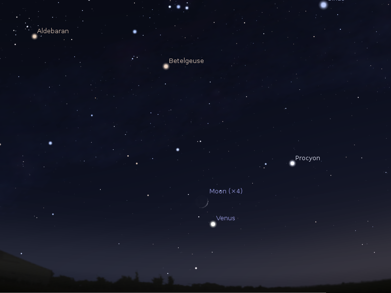 Morning sky on Saturday August 19 looking east as seen from Adelaide at 5:56 ACST (60 minutes before sunrise). Venus is dazzling below the bright star Betelgeuse and forms a triangle with Procyon and Betelgeuse. The crescent Moon is close to the Venus.